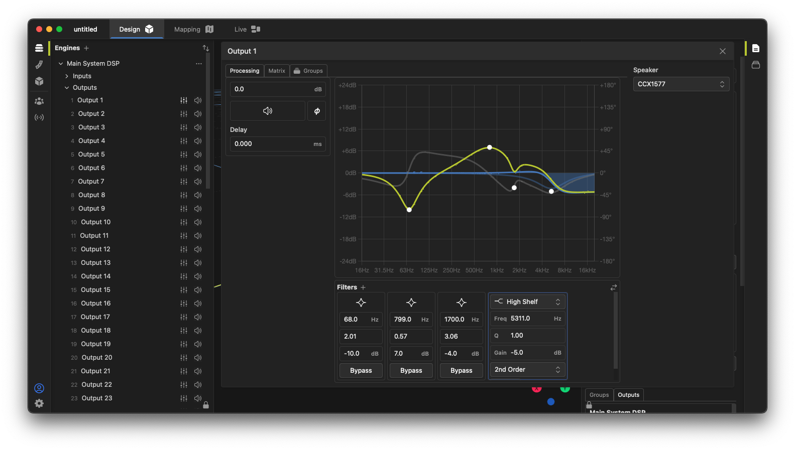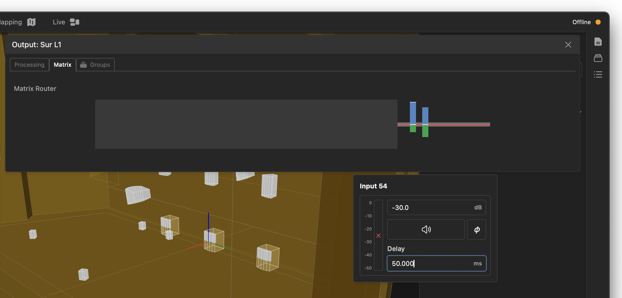 All Fulcrum DSP processors contain a central mix matrix allowing signals to be routed from any input to any output with separate gain, mute, delay, and polarity control at each crosspoint. Access the matrix with the Matrix tab from any output processing window:
