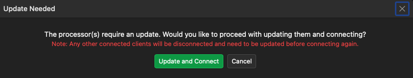 When new versions of the One application are released, the core software on the processor must also be updated to match. When connecting after a software update, the following window will appear allowing the user to update the processor to match the software version of the One application. This update happens quickly but will stop audio processing during the update process. Note that any other clients connected to the system must also be updated to communicate properly with the newly updated processor.