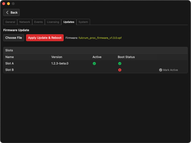 The Updates tab allows for updating the firmware of the connected processor when a major update is available. To update, click the Choose File button and select the firmware file from your local computer. One will upload the file to the processor. Click Apply Update & Reboot to start the update process. A message will indicate that the processor is rebooting once the update is complete.